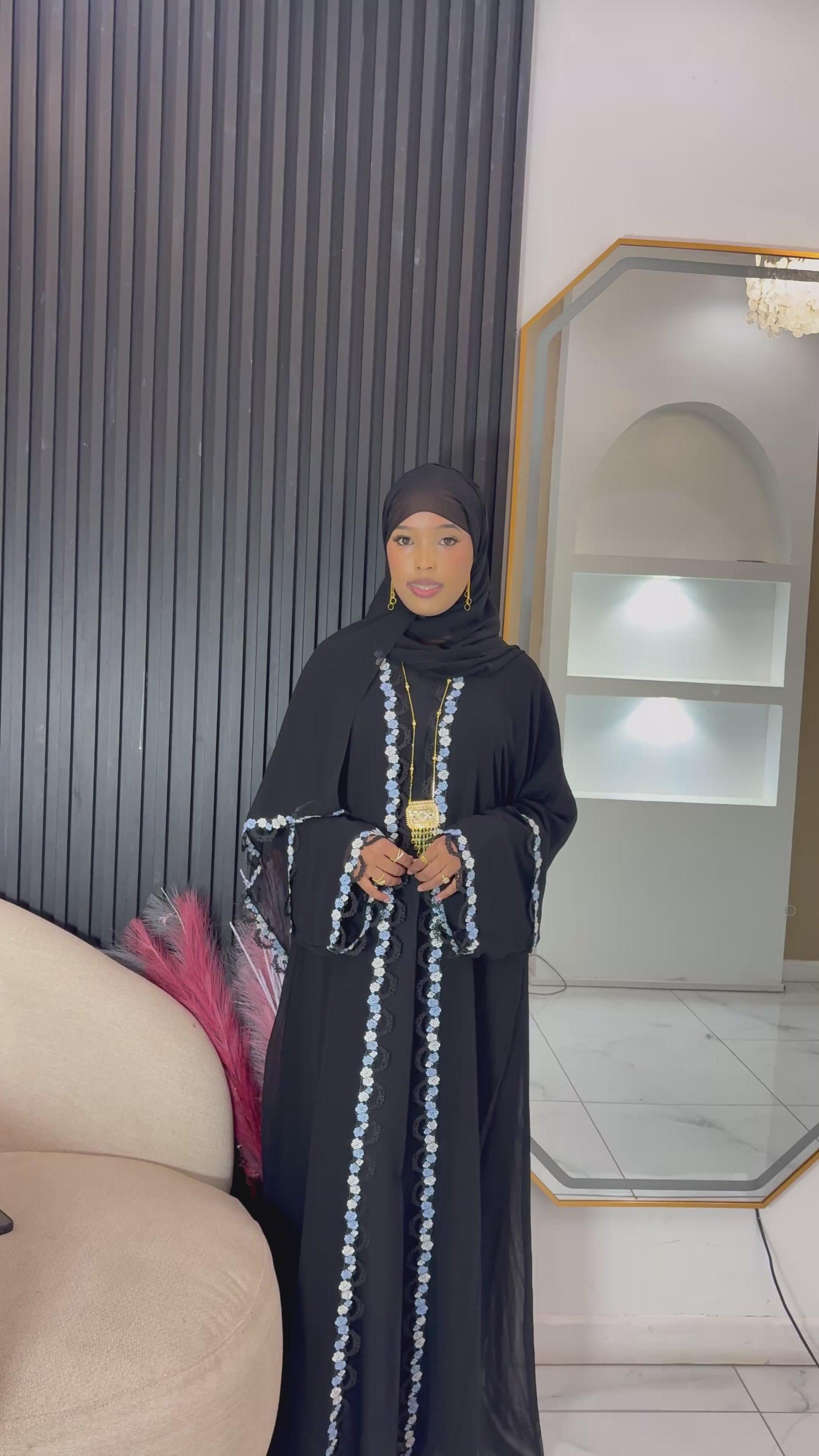 The Amar Floral set includes a floral lace abaya, hijab, and inner dress. Crafted from lightweight chiffon and nida fabric, this combination ensures comfort and elegance. Ideal for Eid celebrations, the layering provides versatile styling options while maintaining a formal appearance suitable for various occasions.