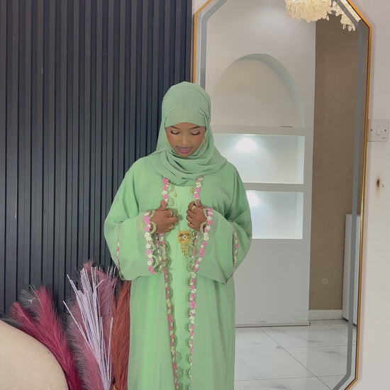 The Amar Floral set includes a floral lace abaya, hijab, and inner dress. Crafted from lightweight chiffon and nida fabric, this combination ensures comfort and elegance. Ideal for Eid celebrations, the layering provides versatile styling options while maintaining a formal appearance suitable for various occasions.
