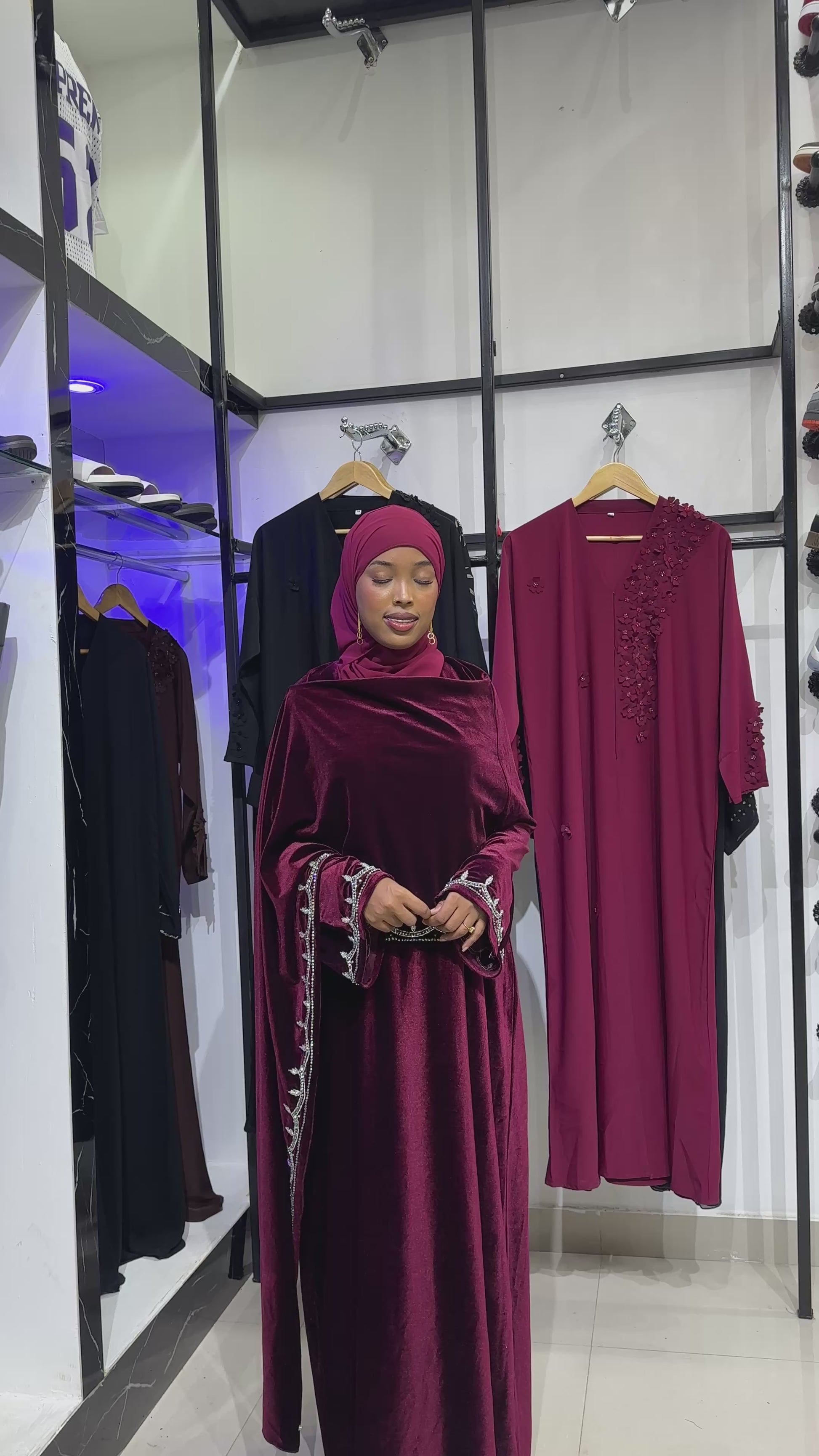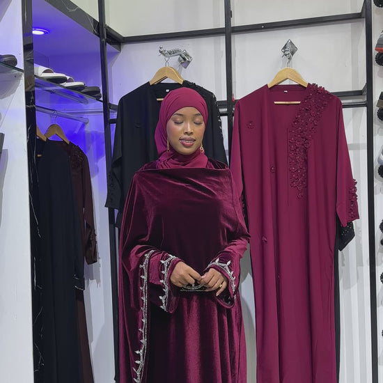 The VIP velvet abaya is crafted from premium velvet fabric, ensuring a luxurious feel and appearance. Its elegant design is complemented by a matching hijab, providing a cohesive and sophisticated look suitable for formal occasions. This garment combines style with comfort, making it an ideal choice for discerning individuals.